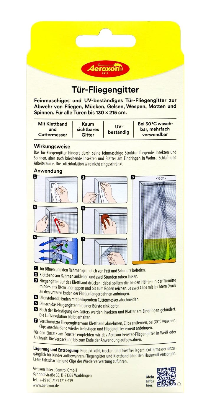 Alles, was keine Miete zahlt, bleibt draußen. Das Tür-Fliegengitter von Aeroxon hält alle fliegenden und kriechenden Insekten sowie Schmutz und Laub außerhalb deiner Wohnung. Du erhälst es in anthrazit für Türen mit einer Maße von bis zu 130×215 cm. Durch das mitgelieferte Messer und Klettband, ist die Montage schnell erledigt.