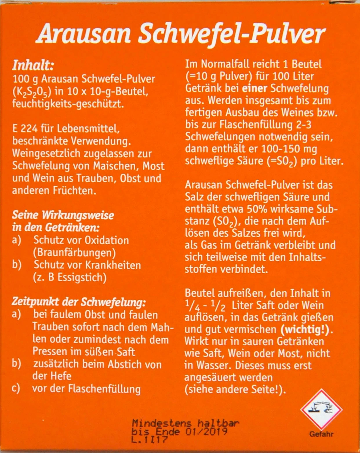 Das Arausan Schwefel-Pulver ist ein multifunktionales Kaliumdisulfit. Es sorgt nämlich dafür, dass Lebensmittel vor dem Oxidieren geschützt werden. Du kannst es in sehr vielen Bereichen verwenden, unter anderem zur Keimfreimachung von Geräten, Flaschen und Korken. Zur Gesunderhaltung des Weines und als Sperrflüssigkeit für Gäraufsätze wird es auch gebraucht. Und bevor du aus dem Staunen nicht mehr rauskommst – das frische Aussehen von geschnittenem und geschältem Obst kann hiermit zusätzlich erhalten werden.