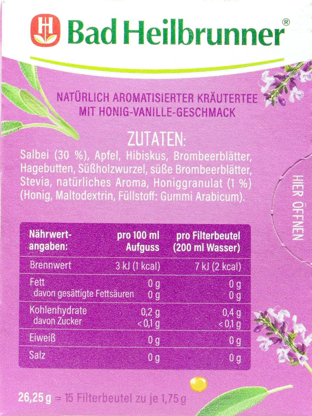 Bad Heilbrunner Salbei Honig Tee ist ein Lebensmittel. Der Tee mit feinem Honig-Vanille Geschmack ist ein beliebter Tee für kalte Stunden. Die wohltuende Mixtur besteht unter anderem aus natürlichen Zutaten wie Brombeerblättern, Süßholzwurzeln und Honigkraut. Die Beutel sind biologisch frei von Metallklammern.