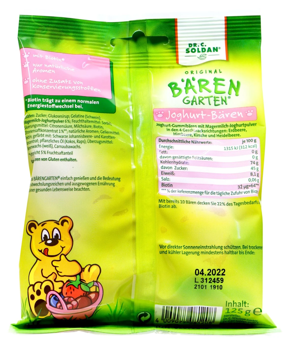 Bärengarten Joghurt-Bären ist ein Fruchtgummiprodukt. Die Bärchen bestehen aus Magermilch-Joghurtpulver und rein natürlichen Aromen. Zusätzlich enthalten sie Biotin. Eine Tüte ist mit den Geschmacksrichtungen Erdbeere, Himbeere, Kirsche und Heidelbeere gefüllt.