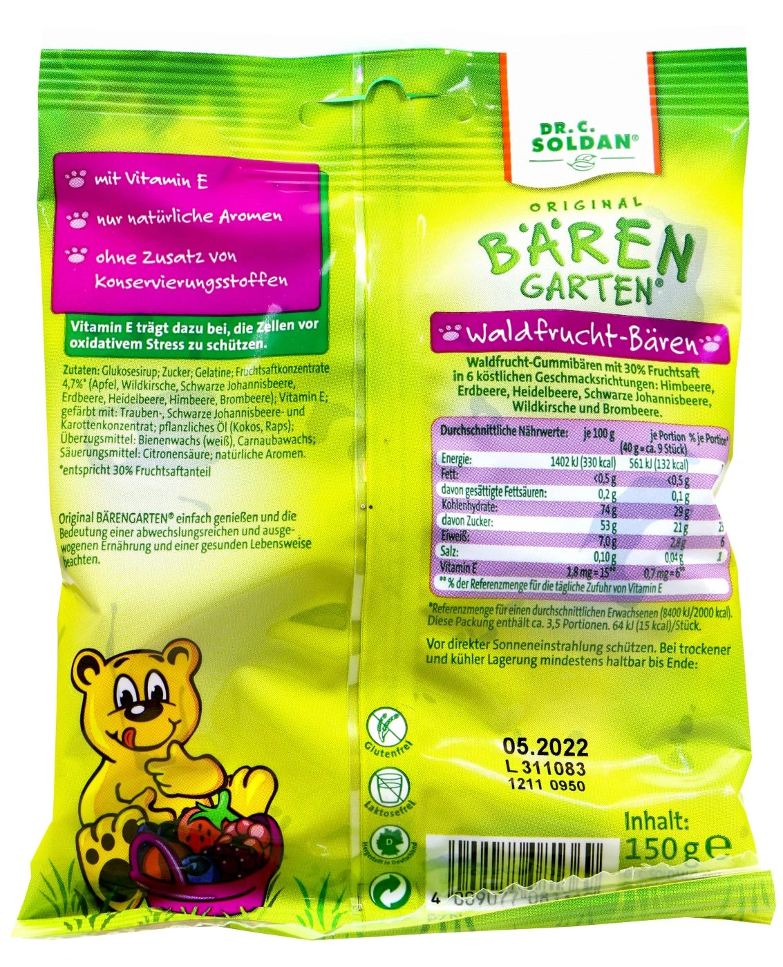 Bärengarten Waldfrucht-Bären ist ein Fruchtgummiprodukt. Die Bärchen bestehen zu 30% aus Fruchtsaft und rein natürlichen Aromen. Zusätzlich enthalten sie Vitamin E. Eine Tüte ist mit den Geschmacksrichtungen Erdbeere, Himbeere, Wildkirsche, Heidelbeere, schwarze Johannisbeere und Brombeere gefüllt.
