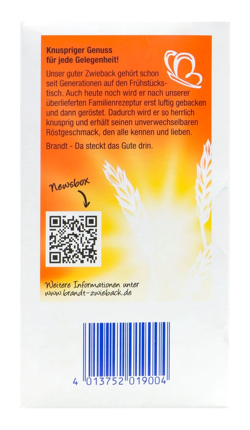 Brandt Markenzwieback zählt seit vielen Jahren zu den besten Zwiebacken. Der Zwieback ist goldgelb,