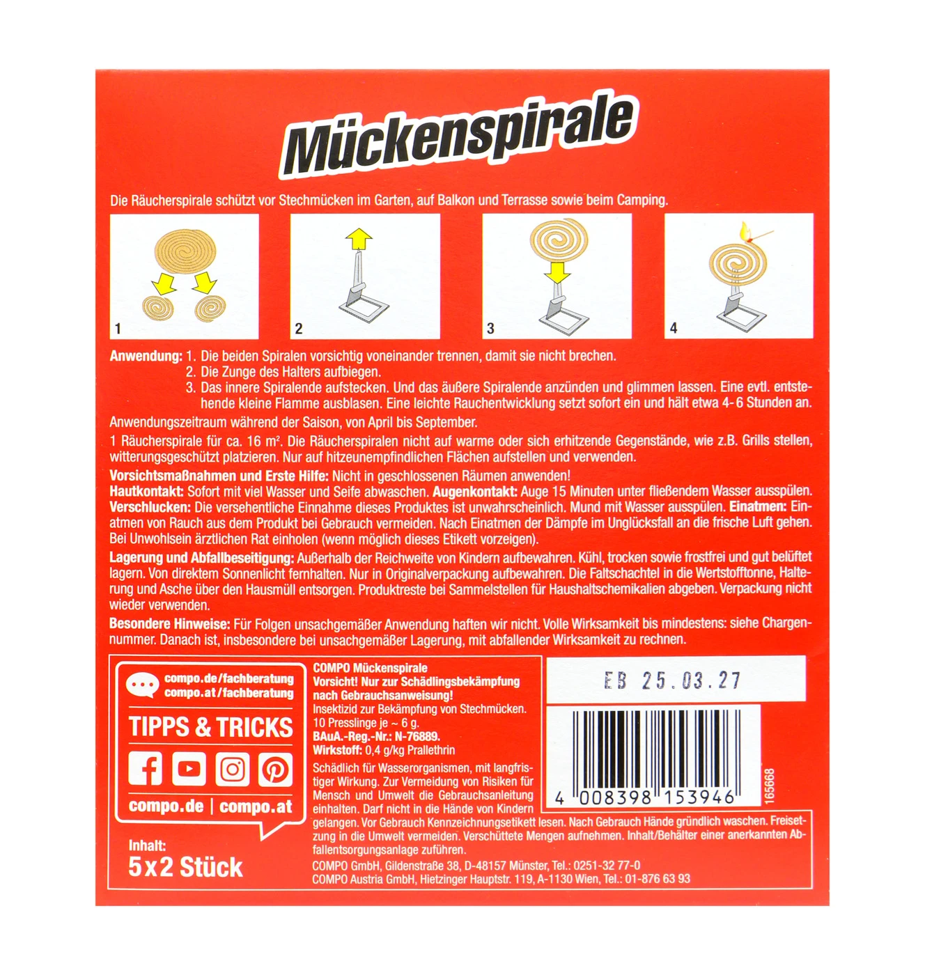 Schluss damit! Die Compo Mückenspirale dampft ab, was das Zeug hält. Der entstehende Rauch vertreibt Mücken und sogar Wespen. Siehst du das Zelt in 100 Metern Entfernung?! Richtig, die ungebetenen Gäste suchen sich nun dort ihr nächstes Opfer. Du hast endlich deine Ruhe!