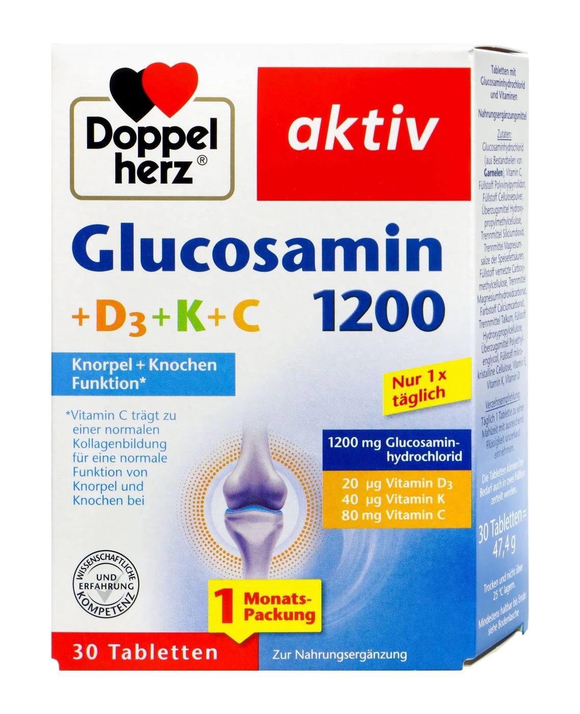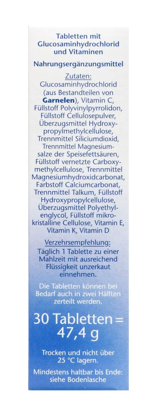 Doppelherz Glucosamin 1200 + D3 + K + C Tabletten, 30 er sind ein Nahrungsergänzungsmittel. Es unterstützt eine normale Knorpel- und Knochenfunktion, die normale Muskelfunktion, sowie einen normalen Calciumspiegel und schützt vor oxidativem Stress. Mit den Vitaminen C, D, K & E.
