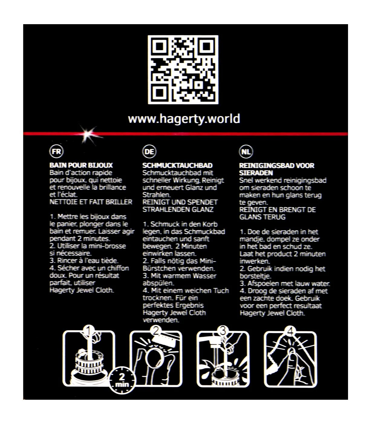 Hagerty Jewel Clean ist ein zuverlässiges Politurmittel für echte Juwelen. Das Pflegemittel wird als Reinigungsbad vorbereitet und hilft Rückstände und Beschläge zu entfernen. Es bringt den Edelsteinen ihren luxuriösen Glanz zurück. Durch die Anwendung werden die Juwelen gepflegt und erhalten einen Anlaufschutz. Schmuck aus Gold, Platin, Diamanten, Saphir und Runbin wird gründlich sauber und dadurch strahlend, edel und kostbar.