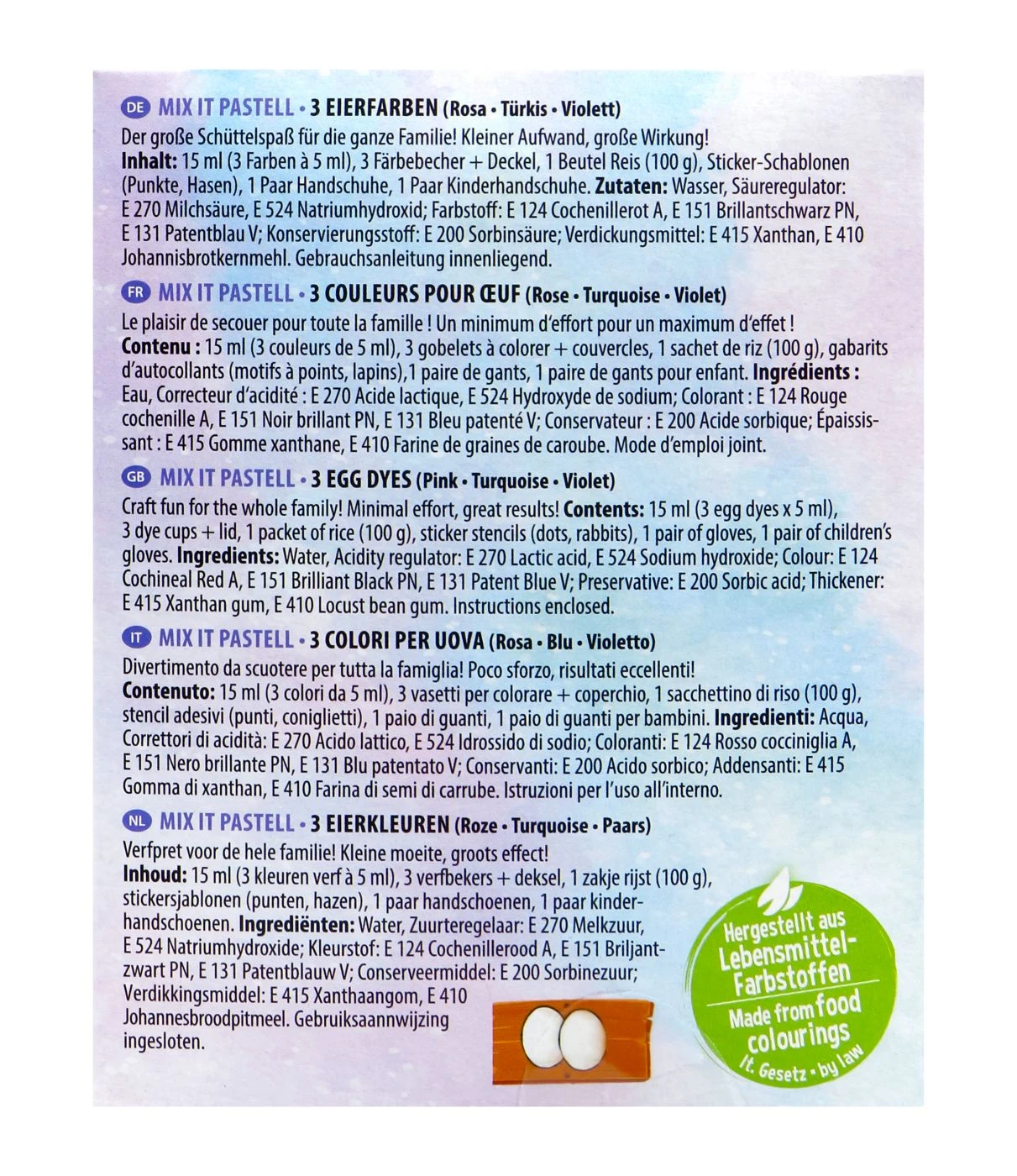 Der große Schüttelspaß für die ganze Familie! Kleiner Aufwand, große Wirkung! Die Heitmann Eierfarben Mix it enthalte 3 Farben (Rosa, Türkis, Violett).
