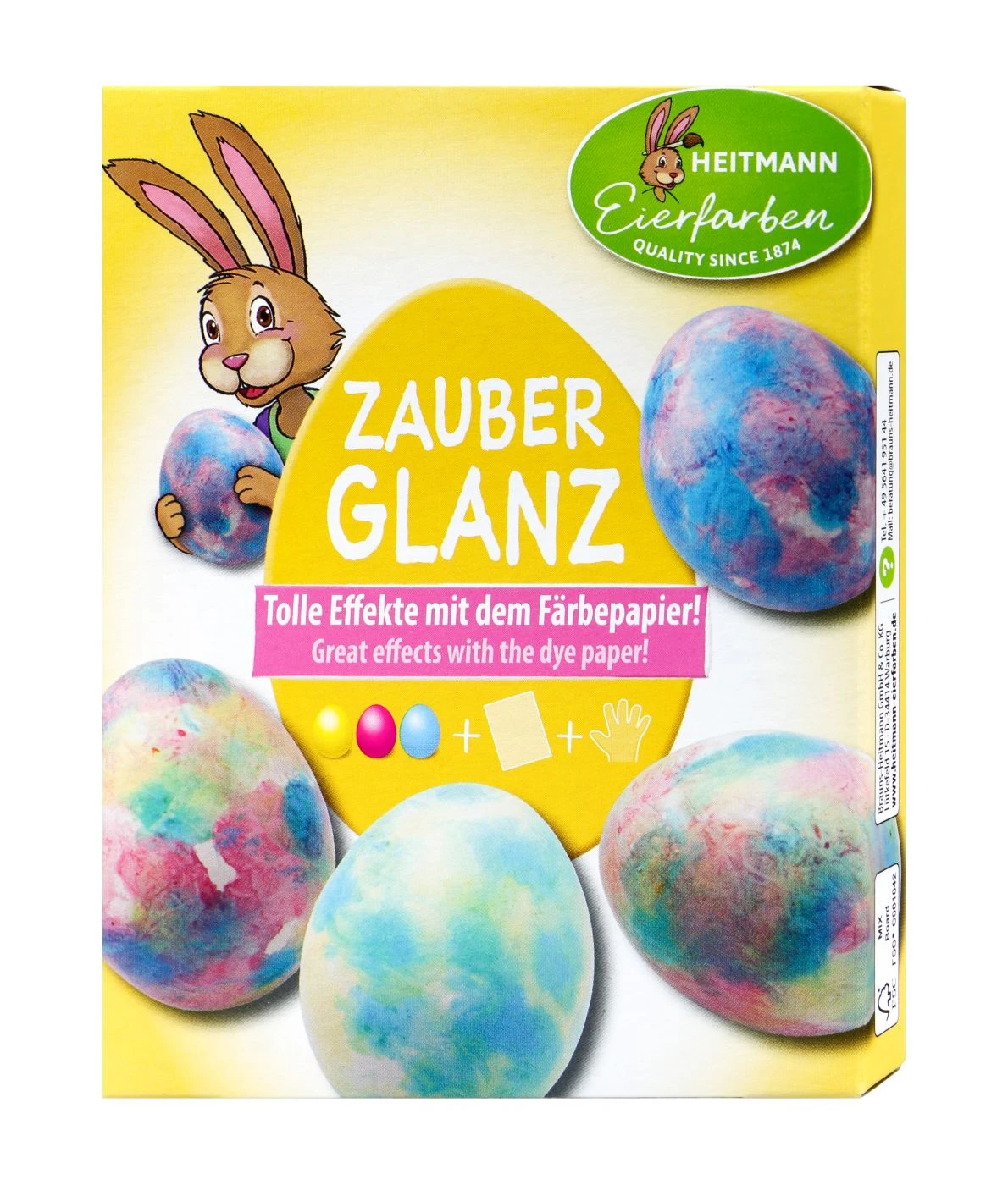 Heitmann Eierfarben Zauberglanz sind eine tolle Art mit Färbepapier die Eier zu gestalten. Das Set enthält drei Farben (Gelb, Pink, Blau)
