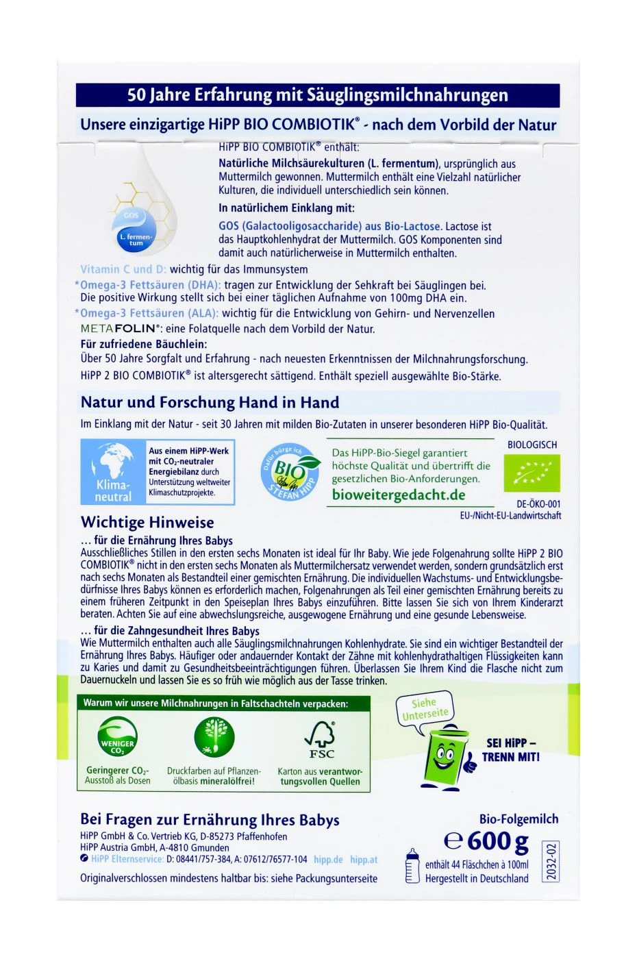 Hipp 2032 Bio Folgemilch 2 Combiotik – 600 G
