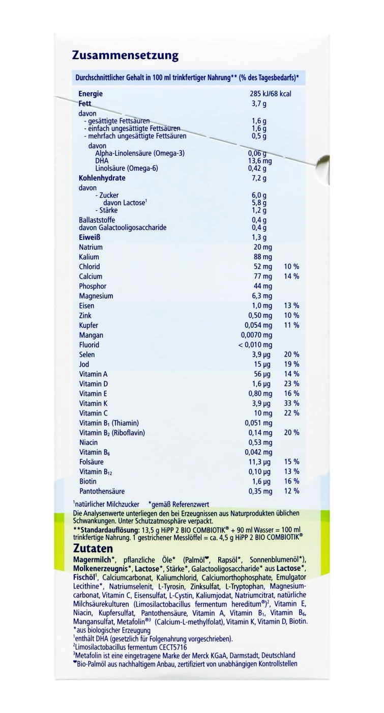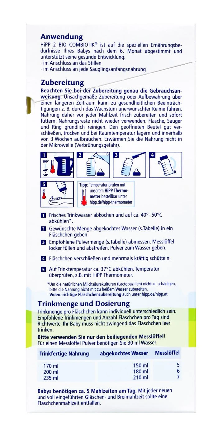 Die Hipp Bio Combiotik Folgemilch bietet alle wichtigen Nährstoffe für die Ernährung eines Säuglings nach dem 6. Monat. Die Folgemilch enthält wichtige A, C und D Vitamine für das Immunsystem des Babys. Sie eignet sich sehr gut als Folgenahrung nach der Stillzeit, sie sättigt gut und fördert eine gesunde Darmflora.