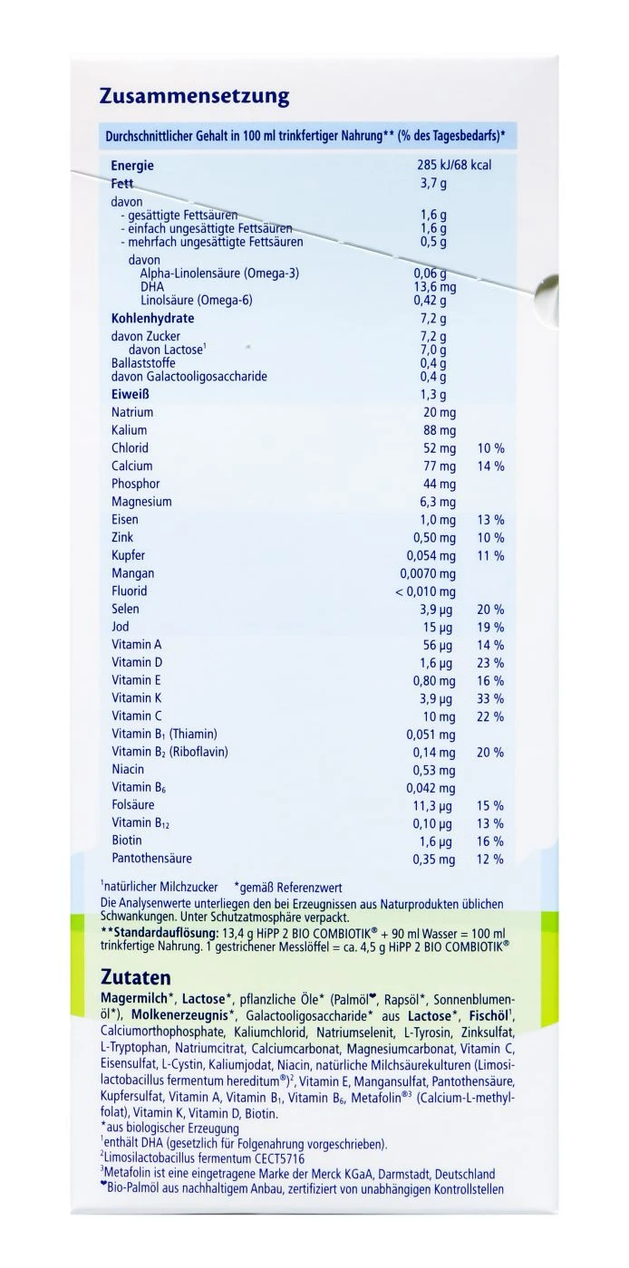 Die Hipp Bio Combiotik Folgemilch 2 bietet alle wichtigen Nährstoffe für die Ernährung eines Säuglings nach dem 6. Monat. Die Folgemilch enthält wichtige A, C und D Vitamine für das Immunsystem des Babys. Sie eignet sich sehr gut als Folgenahrung nach der Stillzeit, sie sättigt gut und fördert eine gesunde Darmflora. Ohne Stärke.