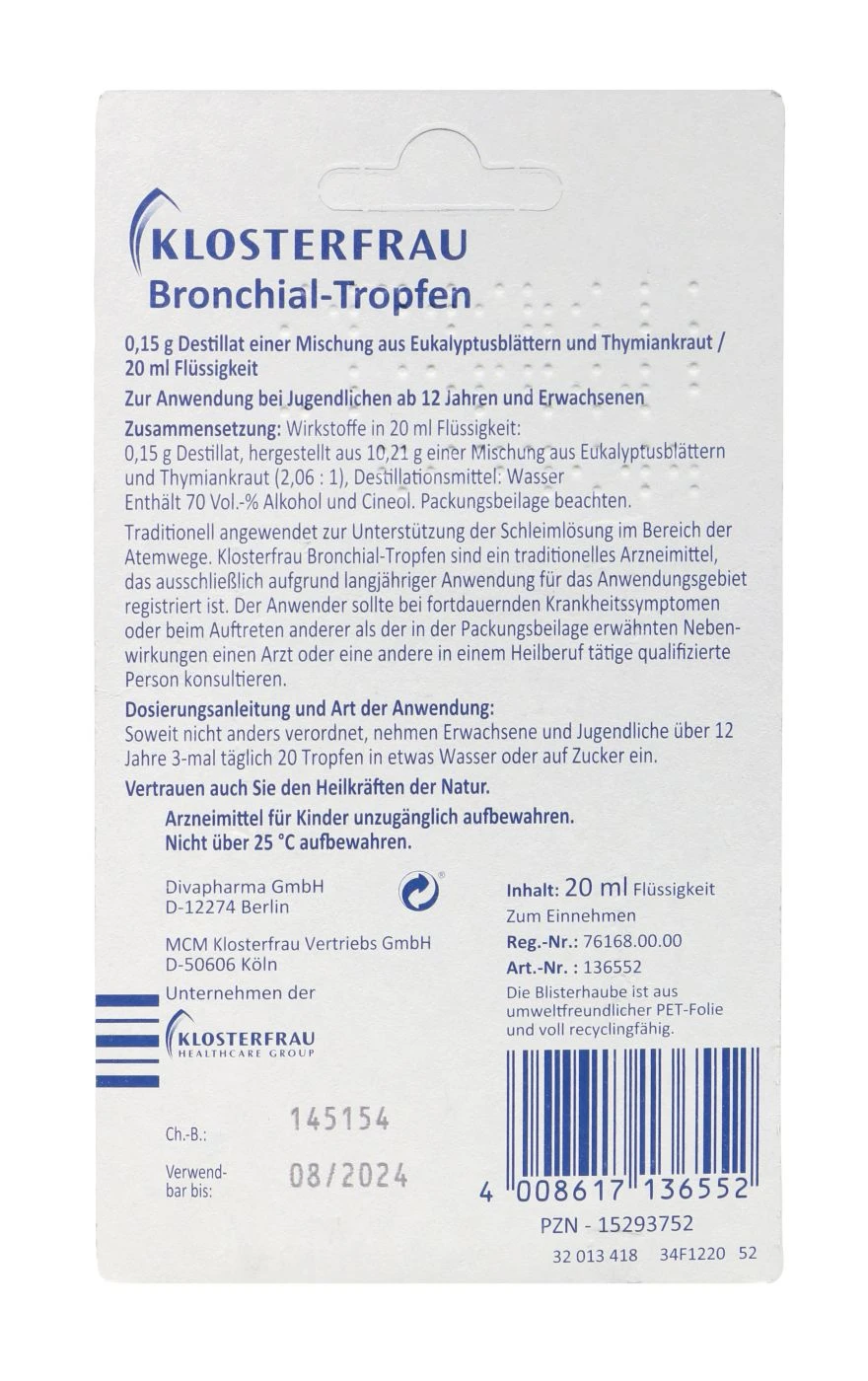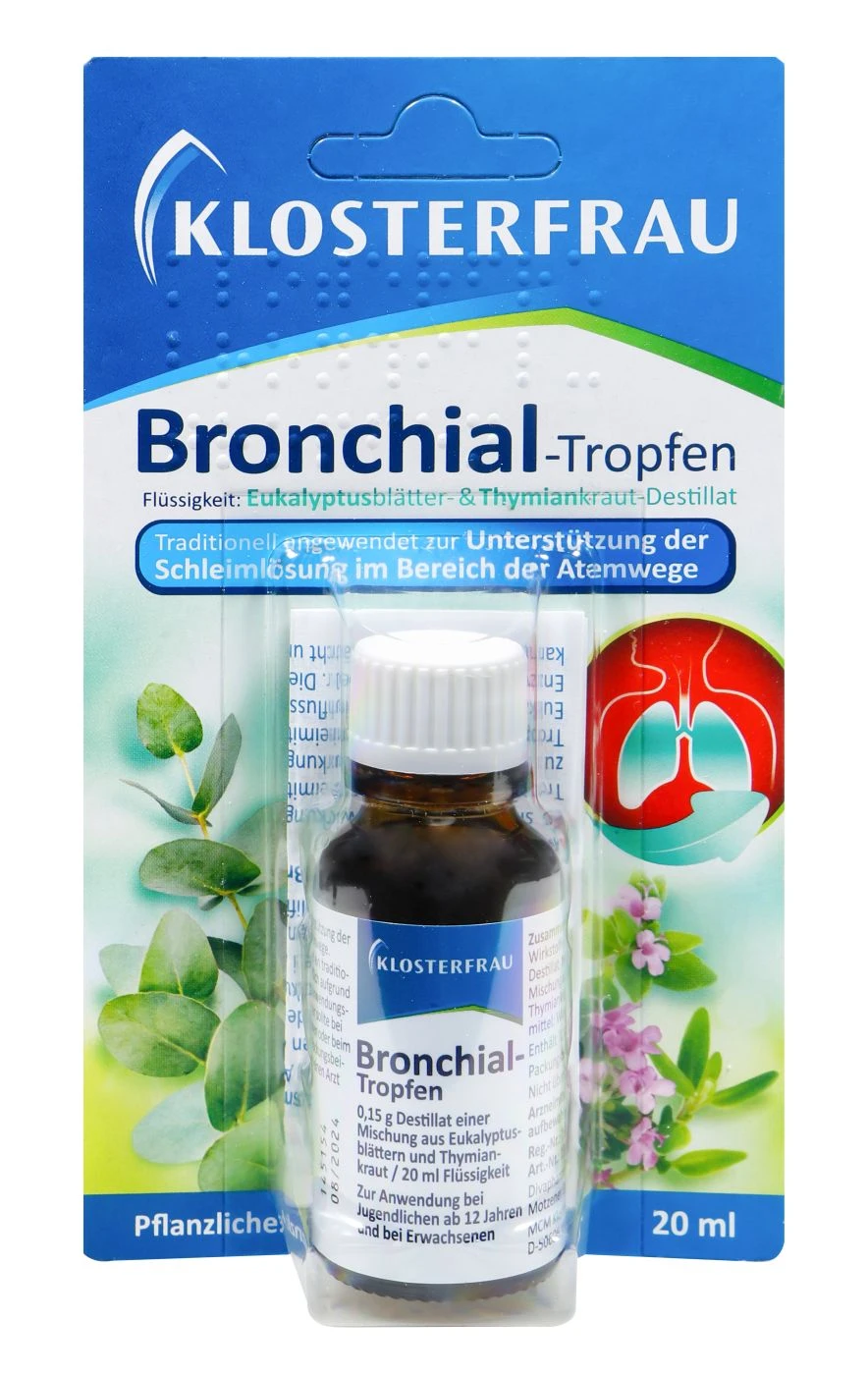 Klosterfrau Bronchialtropfen ist ein pflanzliches Arzneimittel mit Thymian und Eukalyptus zur Befreiung der Atemwege. Das Broncholind hilft zuverlässig bei Husten und Heiserkeit, indem es den Schleim löst und den gereizten Hals beruhigt.