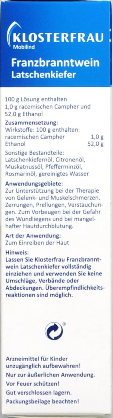 Klosterfrau Franzbranntwein mit Latschenkiefer ist ein pflanzliches Arzneimittel zum Einreiben der Haut.