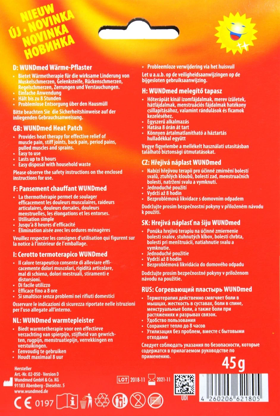 Wundmed Natürliches Wärme-Pflaster ist ein Medizinprodukt zur Anwendung auf verspannte oder schmerzende Körperregionen. Durch das Pflaster wird die Region durchwärmt und der Schmerz gelindert. Besonders wirksam bei Muskelschmerzen, Gelenksteife, Rückenschmerzen, Regelschmerzen, Zerrungen und Verstauchungen.