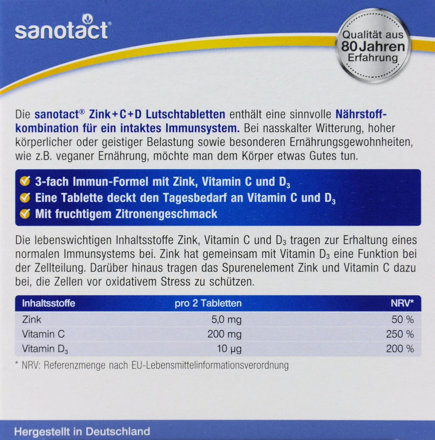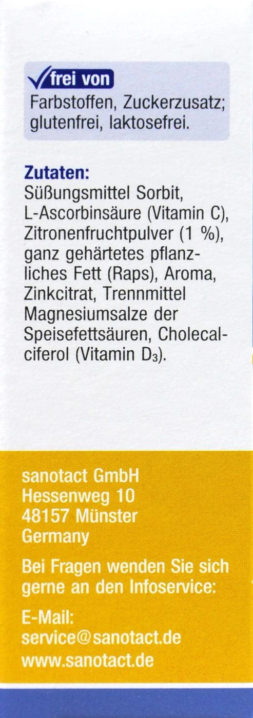 Sanotact Zink + C + D Lutschtabletten sind ein Nahrungsergänzungsmittel. Die Nährstoffkombination unterstützt das Immunsystem, besonders bei kaltem Wetter, hoher Belastung oder besonderen Ernährungsformen. Die Lutschtabletten schmecken nach Zitrone und können täglich
