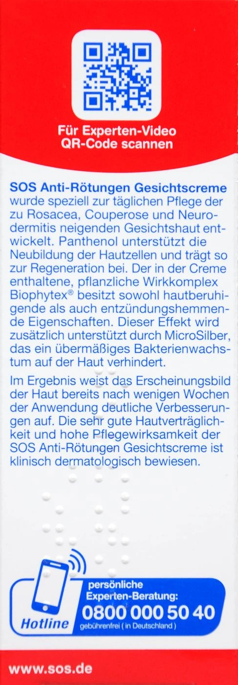 SOS Anti-Rötungen ist eine medizinische Pflegecreme bei höchst empfindlicher Haut. Durch hochwertige Pflegestoffe wird der natürliche Schutzmantel der Haut erhalten. Micro Silber beugt Entzündungen vor und Panthenol fördert die Neubildung der Hautzellen, und hilft so bei einer schnelleren Gesundung und Regeneration. Rötungen und rote Flecken werden reduziert.