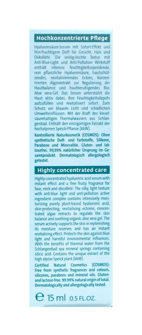 Und das Geheimnis? Intensiv feuchtigkeitsspendende, rein pflanzliche Hyaluronsäure, hautschützendes, revitalisierendes Ectoin, konzentrierter Algenextrakt zur Regulierung der Hautbalance und hautberuhigendes Bio-Aloe vera-Gel, die deine Haut aktiv dabei unterstützen, ihre Feuchtigkeitsdepots aufzufüllen und sofort zu revitalisieren. Mit der Kraft des kieselsäurehaltigen Thermalwassers aus Schlangenbad ist das Serum wie ein Spritzer fruchtiger Frische, der deine Haut zum Leuchten bringt.
