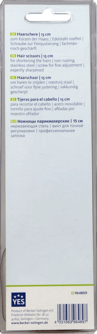 Yes Friseurschere No. 964808 ist 16,5 cm lang und besteht aus einem robusten Material. Die Schere ist spitz und hat lange Scheren, welche sich hervorragend zum Haareschneiden eignen. In sorgfältiger Handarbeit hergestellt und für hohe Ansprüche geeignet.