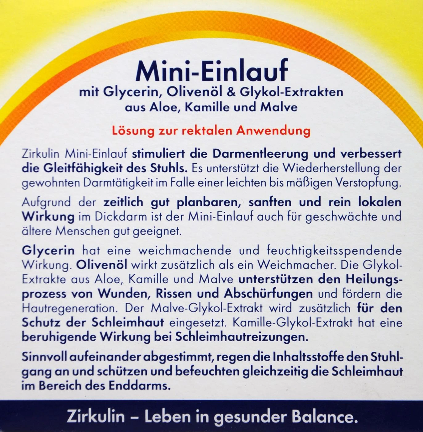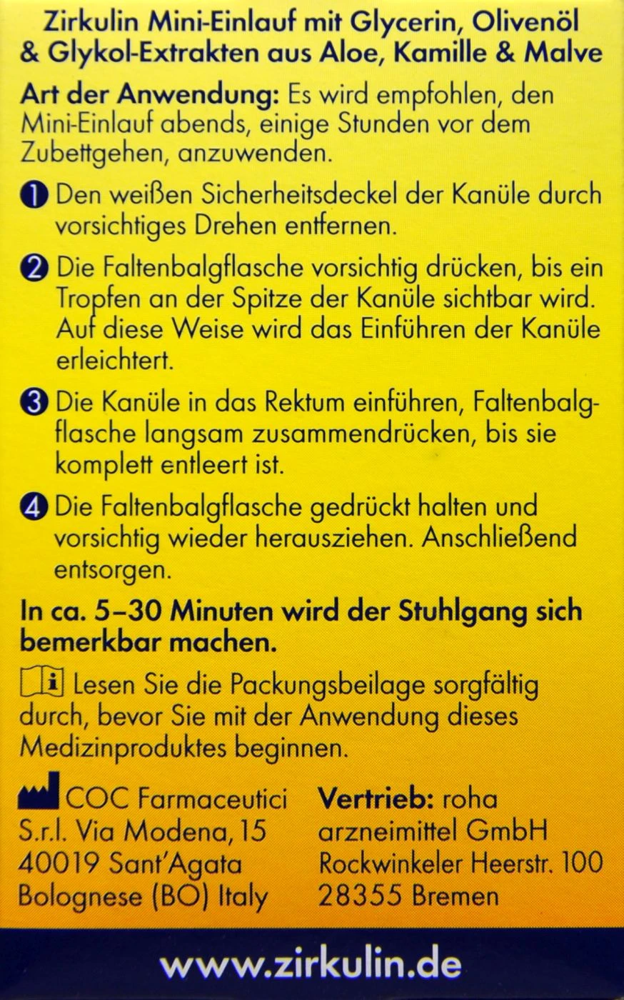 Zirkulin Mini-Einlauf ist ein Medizinprodukt bei leichter bis mäßiger Verstopfung. Der Einlauf wird rektal