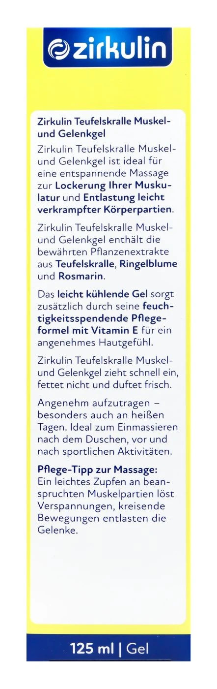Zirkulin Teufelskralle Muskel- und Gelenkgel ist ein wirksames Mittel bei Muskel- und Gelenkverspannungen. Das Gel ist angenehm aufzutragen und lockert die Muskeln. Diese können sich leichter entspannen und schneller vitalisieren, durch die Wirkstoffe von Ringelblume, Rosmarin und Vitamin E.